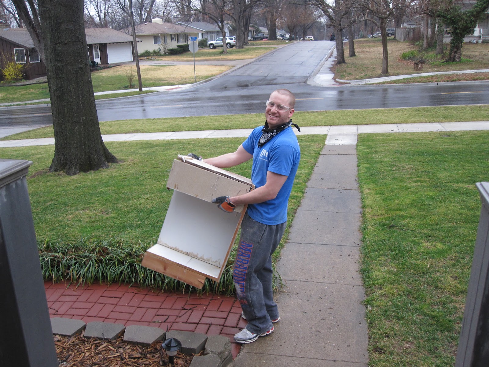 And Jimmy, well he is the muscles of this group. Here he is carrying out half of the vanity down the stairs (very carefully, as I'm standing there saying "please don't drop it on the floor!!")